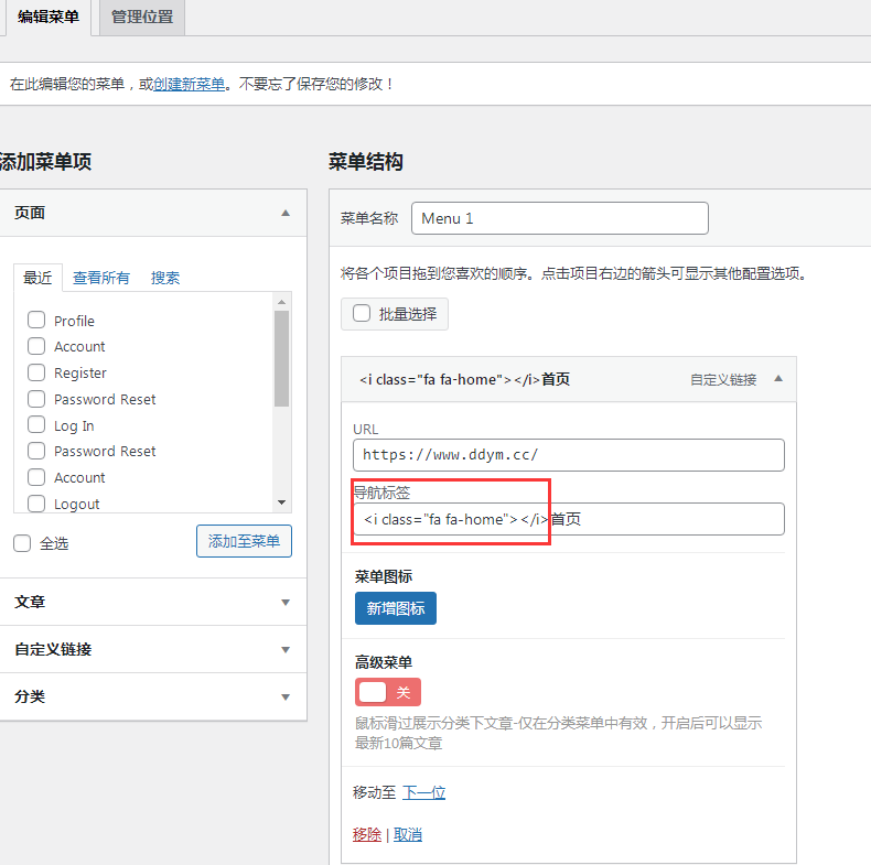 图标大全点击传送门进入挑选,也可以在菜单图标{新增图标}里面直接添加保存或者找图标代码名称。