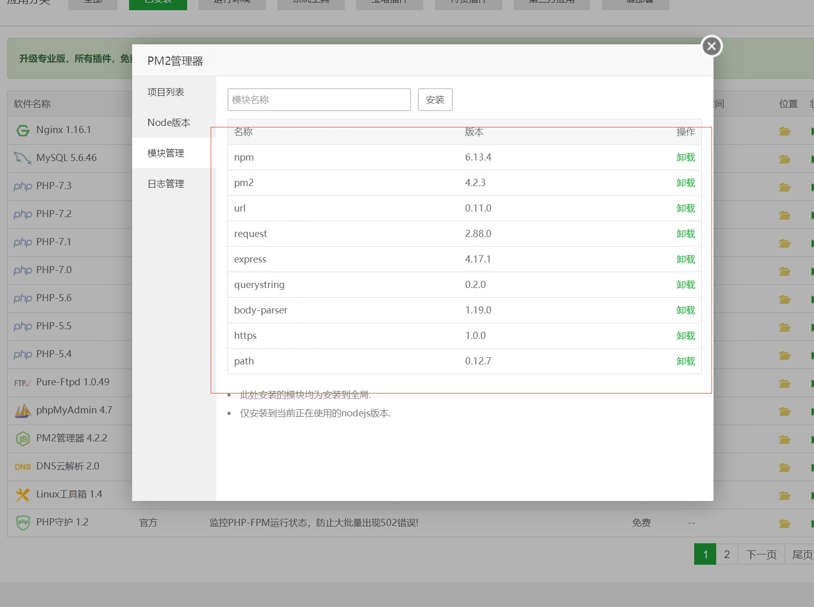 5.前往pm2管理工具的设置,切换版本为最新,安装如下模块