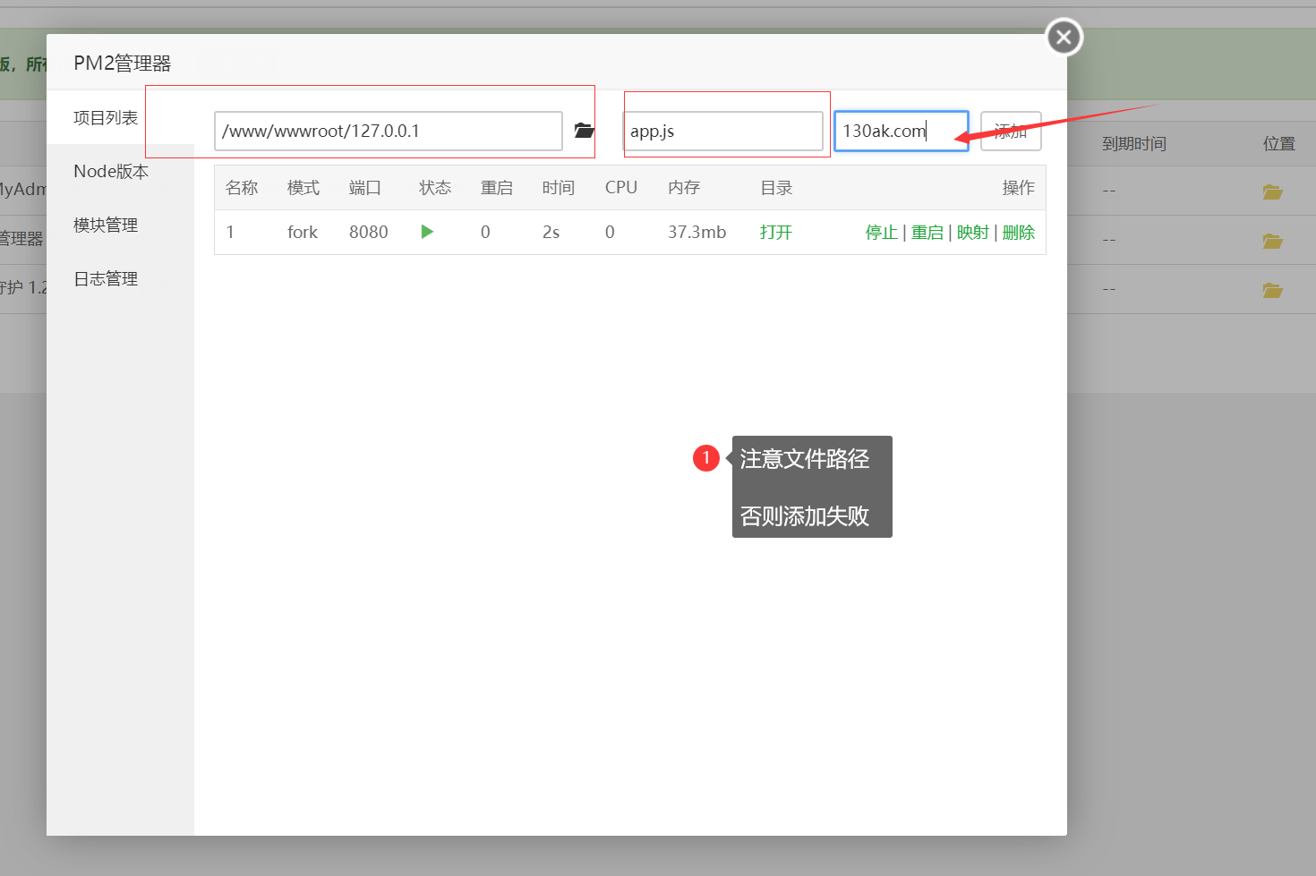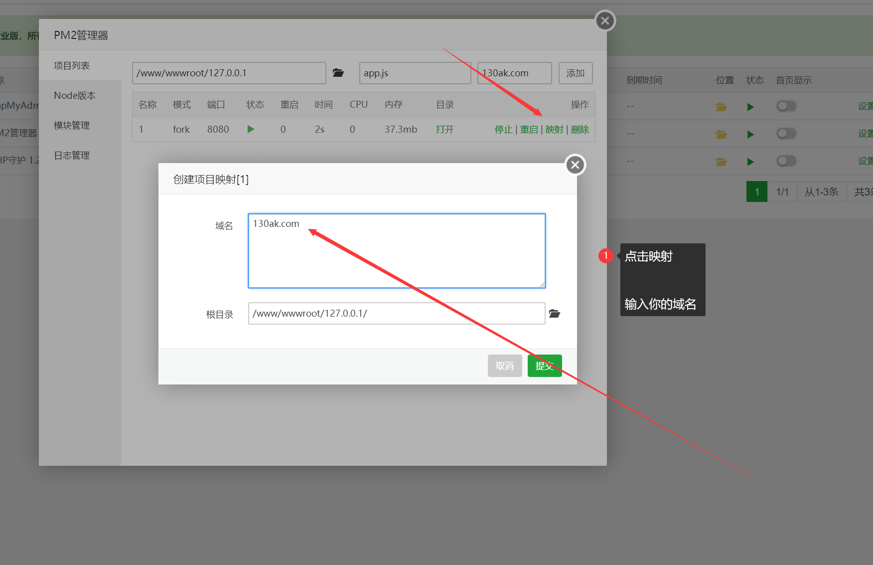 7.添加后看到项目端口为8080即为成功,点击映射,输入域名即可访问