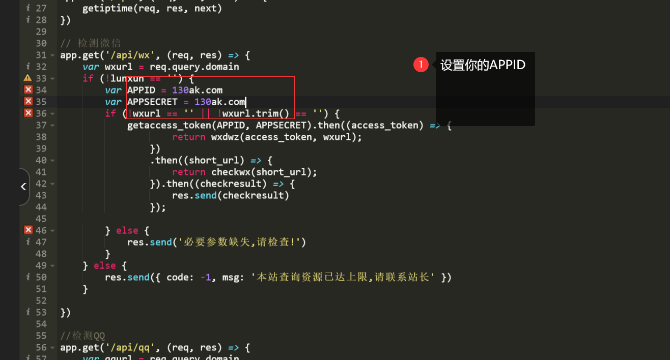 网站修改目录:修改APPID和APPSECRET’:在源码根目录下app.js进行修改,修改网页在: 源码根目录public目录下,修改查询接口在public\static\js下的qq.js和wx.js(默认不需要修改)