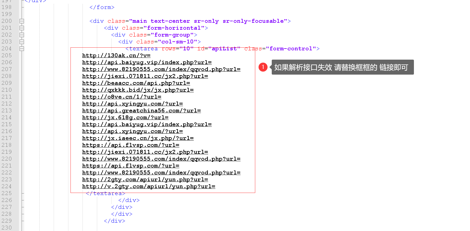 ③:编辑文件index.html,第14、60、72、84、96、160、164、168、176、182、189、195、行修改文字,如需修改解析接口看下图(选中框框内的接口修改即可)